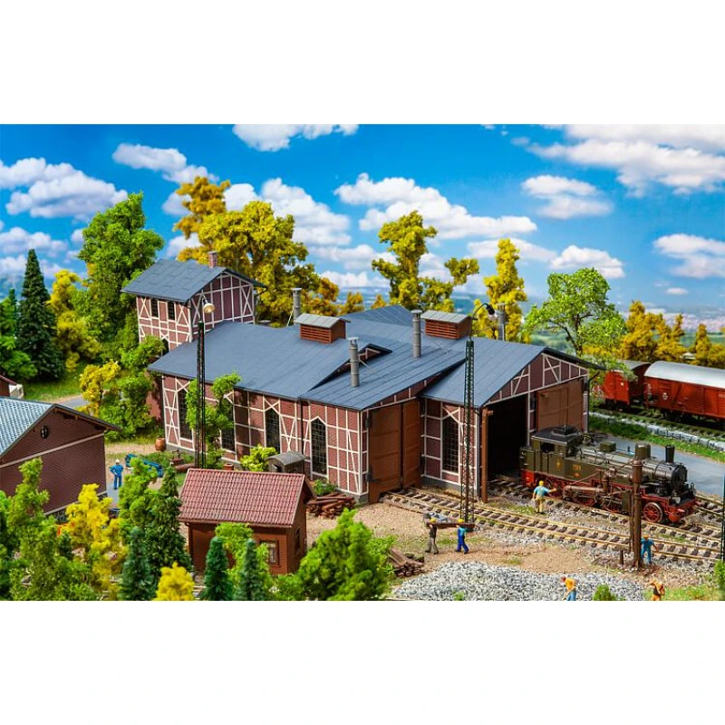 Locomotievenloods met watertoren aan de achterzijde. Het driedelige vakwerkbouwwerk biedt in drie overkappingen van verschillende lengte plaats aan locomotieven met een lengte van buffer tot buffer van 190, 240 en 280 mm (hartafstand spoor: 63 mm). De deuren kunnen handmatig worden geopend en gesloten (deurhoogte: 65 mm).