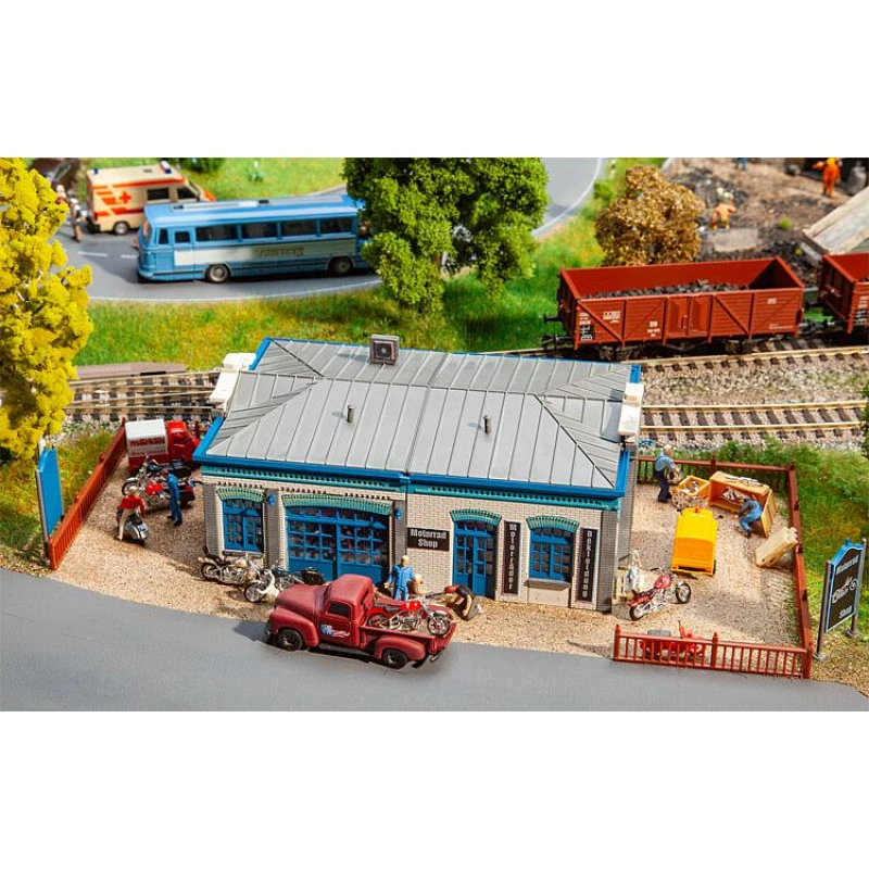 Motorwinkel in een bakstenen gebouw van één verdieping met een markante blauwe poort, deuren, ramen, segmentbogen en friezen. Twee motorfietsen en reclameborden voor de aankleding worden in het bouwpakket meegeleverd.